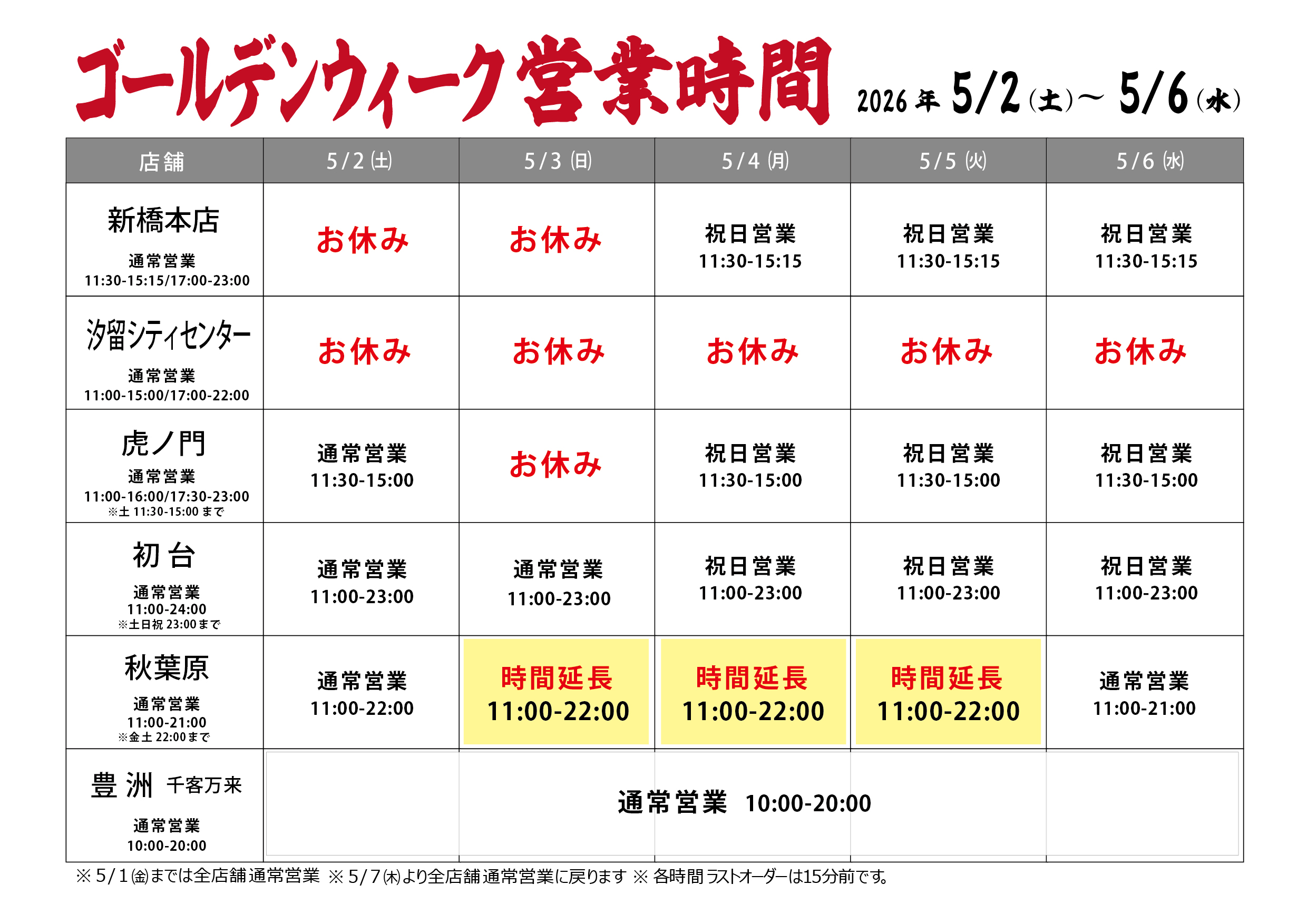 2026年 ゴールデンウィーク期間中の営業時間です。